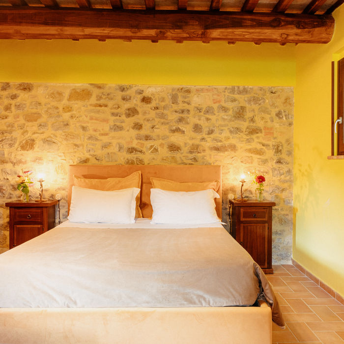 Spend 3 nights with your family in Casale Serena's Quadruple Deluxe Room, a cosy, stone-walled haven that combines simple elegance with rustic comforts for up to four people. Fresh pastries and local specialities set the stage for leisurely, shared moments during a delicious continental breakfast, which is where mornings unfold. Every element here invites you to enjoy the calm, timeless embrace of rural life, whether you choose to spend your days lounging on a sun lounger, strolling through olive-scented gardens, or swimming in the sun-kissed pool.